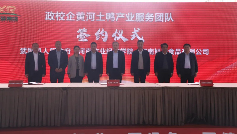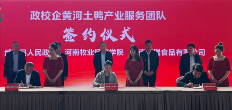 武陟縣政府副縣長蘇瑞君、河南牧業(yè)經(jīng)濟學院副校長楊國宇、河南旭瑞食品有限公司副總經(jīng)理邱國平為政校企三方共建“黃河土鴨”產(chǎn)業(yè)服務團隊簽約。三方將共同構(gòu)建“政府+產(chǎn)業(yè)服務團隊+龍頭企業(yè)”服務合作模式,推動產(chǎn)科教融合發(fā)展。同時,河南牧業(yè)經(jīng)濟學院將授予我們“百名專家助百村(企)工程服務基地”和“博士工作站”兩塊響亮的牌子,由12名專業(yè)博士為集團提供的技術(shù)創(chuàng)新支持。